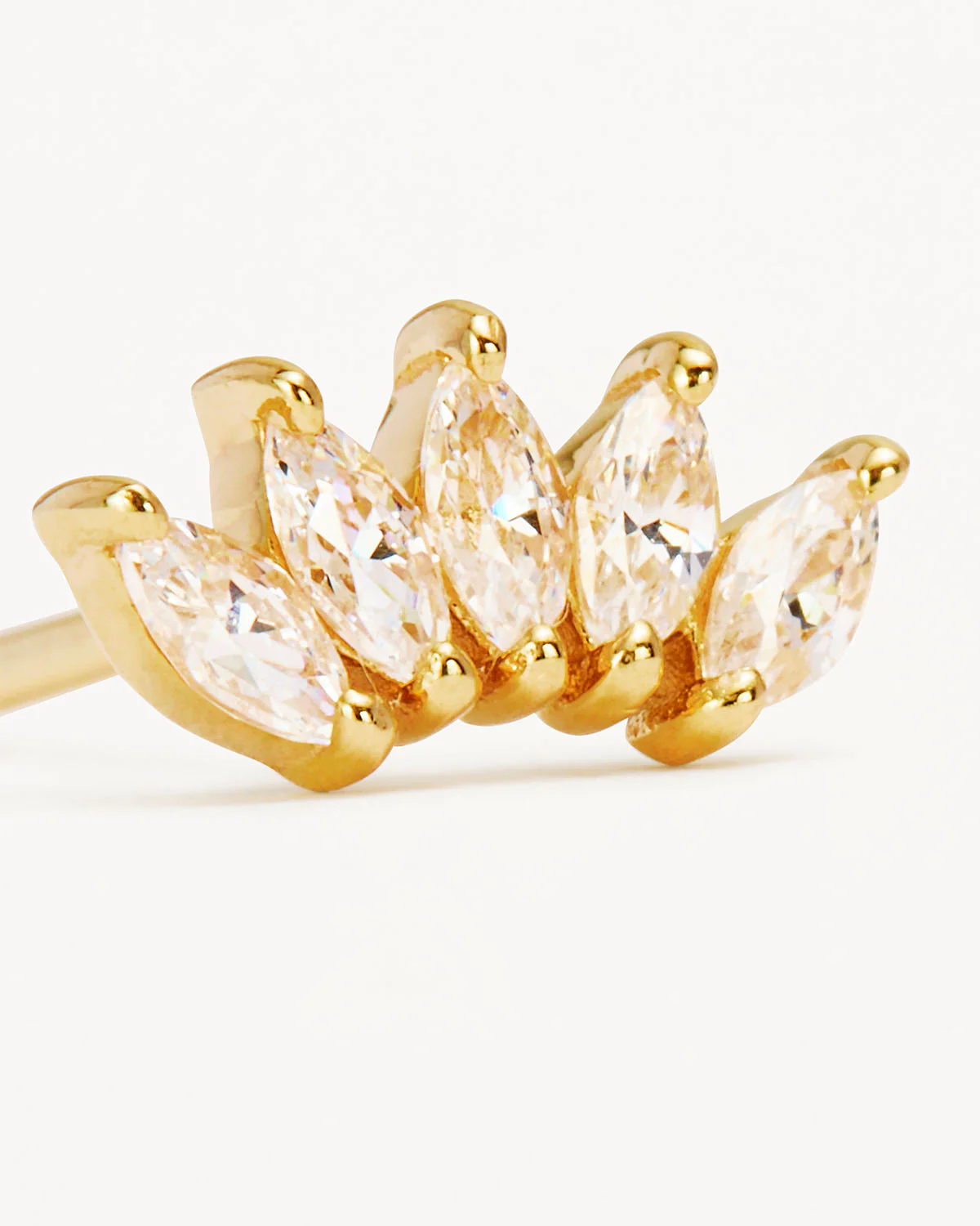 Discover inner peace and the beauty of new beginnings with our 14k Gold Eternal Lotus Crystal Cartilage Earring. This internally threaded flatback design features 5 marquise CZ crystals that fan out to create a beautiful lotus flower. This statement flatback earring is perfect for conch, flat and other cartilage placements.