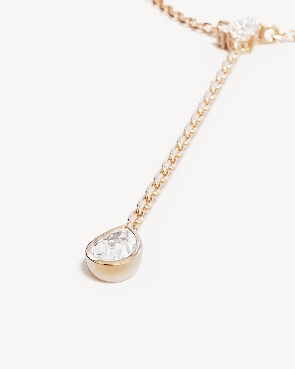 Features a delicate cluster of cubic zirconias and bezel set pear-cut crystal.