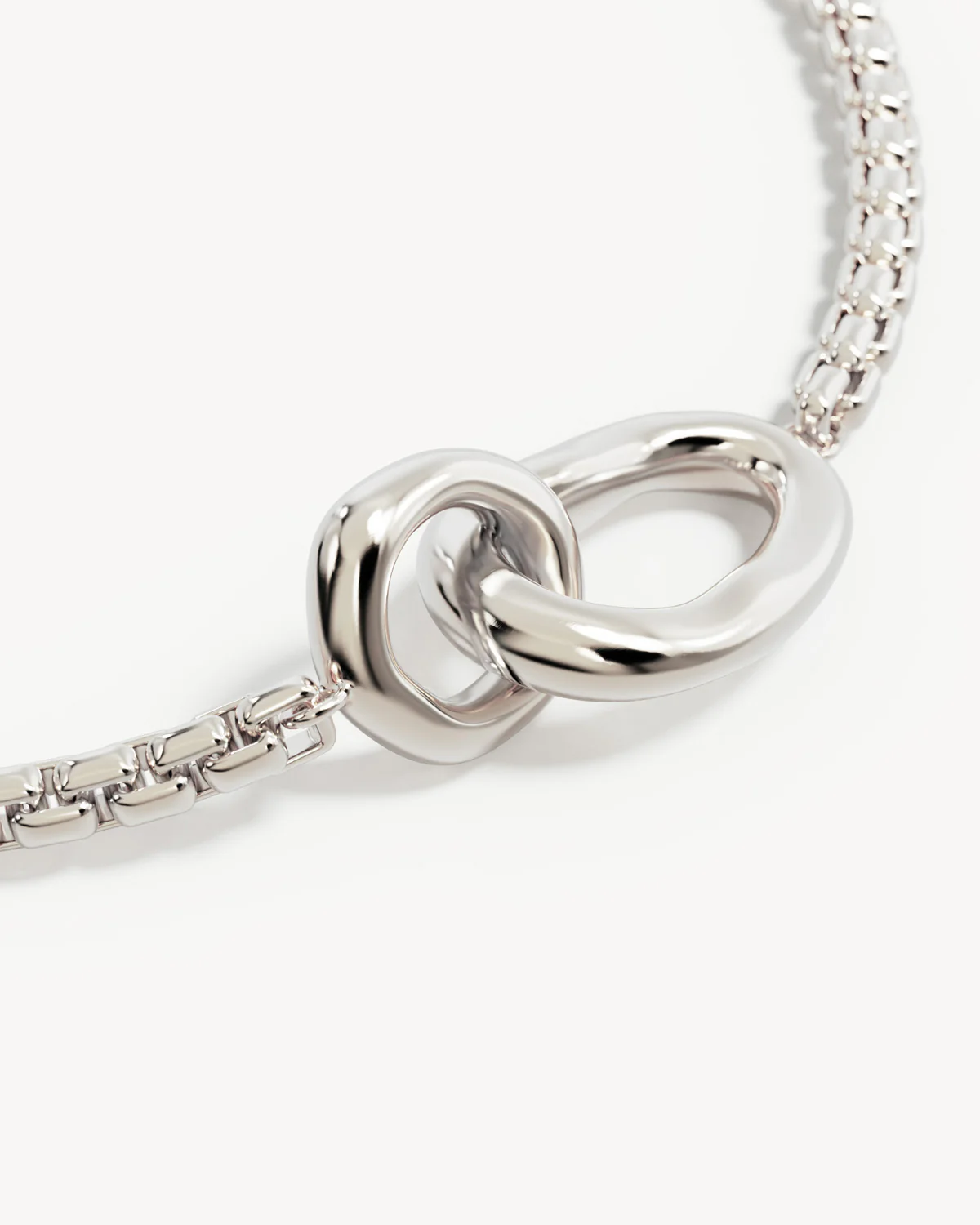 The Infinity Necklace is an abstract take on the infinity symbol and connection. Featuring interlocking pendants fixed on a box chain, this keepsake is rhodium plated for a darker finish.