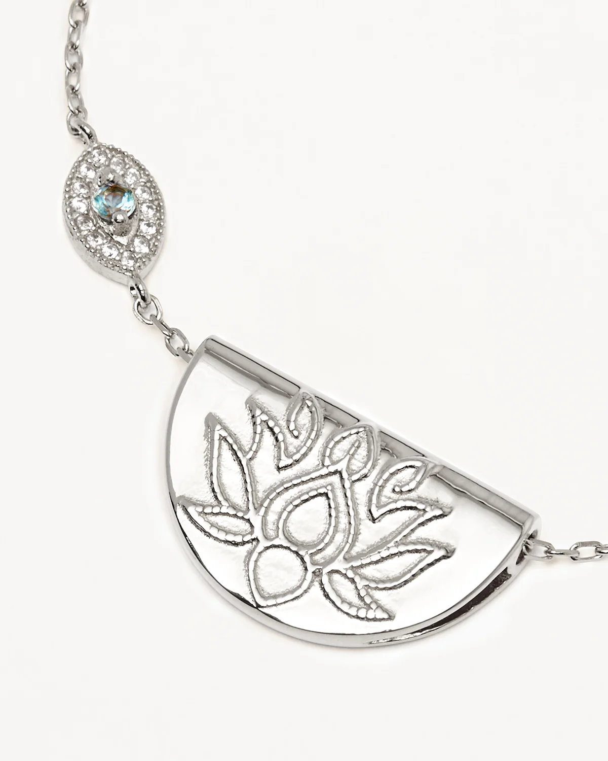 Face every new beginning in your life with a sense of peace and tranquillity. Our Silver Eye of Peace Lotus Necklace features the Lotus Flower for Enlightenment and rebirth and an Aquamarine encrusted evil eye for protection against negative energies. Both of these ancient symbols work in harmony to guide and protect you on your path to self-discovery and spiritual fulfilment.